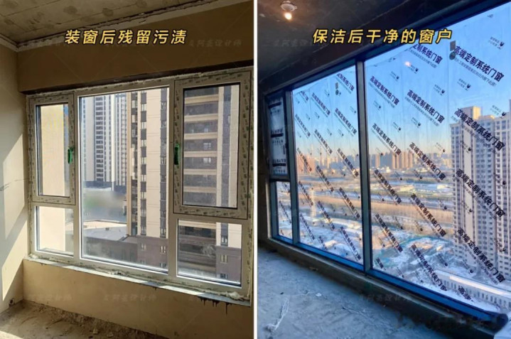 业主必看:保洁时让师傅用专用玻璃刮刀,别用钢丝球(会刮花玻璃)。重点清理玻璃上的胶印、窗框里的水泥渣,擦完后看着亮堂,也省得自己再动手。