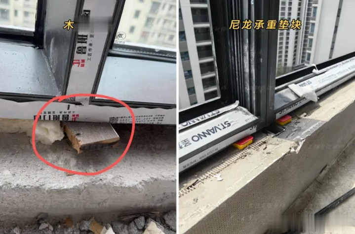 业主必看:垫块要垫在窗框受力点(比如四个角下方),不能随便塞在中间。尼龙垫块承重能力强,环保耐腐蚀!,摸起来硬挺,别让师傅用泡沫块或木块冒充。