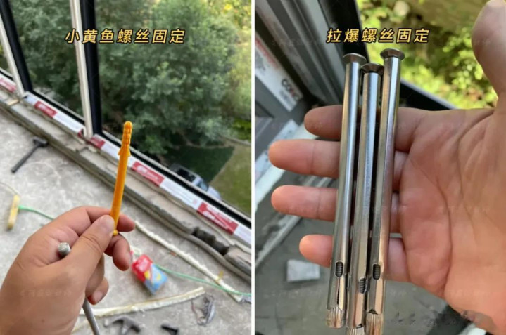 业主必看:拉爆螺丝间距不能超过 50cm,窗框四个角必须各拧 1 颗,这样受力才均匀。装完可以问师傅要螺丝样品,对比一下是不是你要求的拉爆螺丝(粗且带膨胀管)。