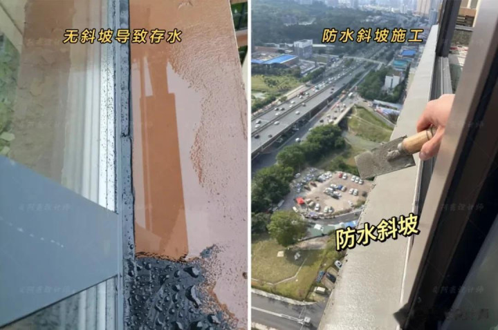 业主必看:防水斜坡要向外倾斜 5° 以上,让雨水顺着斜坡流走,而不是往窗缝里渗。尤其高层和台风多发区,没这道工序,暴雨天窗户很可能变成 “水帘洞”,墙体受潮发霉是迟早的事。